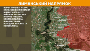 На Лиманському напрямку ворог провів 21 атаку. Намагався вклинитися в нашу оборону у районах населених пунктів Греківка, Новомихайлівка, Шандриголове, Колодязі, Торське та Новоселівка.