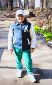 Одяг: синьо-біла куртка з білою наліпкою з літерою «А»