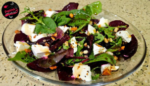 Печений буряк, бринза (або фета за бажанням), мікс зелені, підсмажені горішки. Заправка - мікс олії, меду, трохи соєвого соусу, лимонного соку, гірчиці за бажанням).