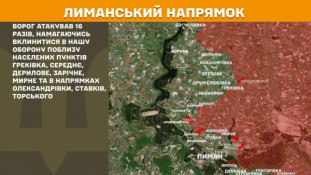 На Лиманському напрямку ворог атакував 16 разів, намагаючись вклинитися в нашу оборону поблизу населених пунктів Греківка, Середнє, Дерилове, Зарічне, Мирне та в напрямках Олександрівки, Ставків, Торського.
