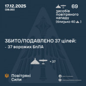 У ніч на 17 грудня окупанти атакували Україну 69-ма ударними БпЛА типу Shahed, Гербера і безпілотниками інших типів із напрямків.