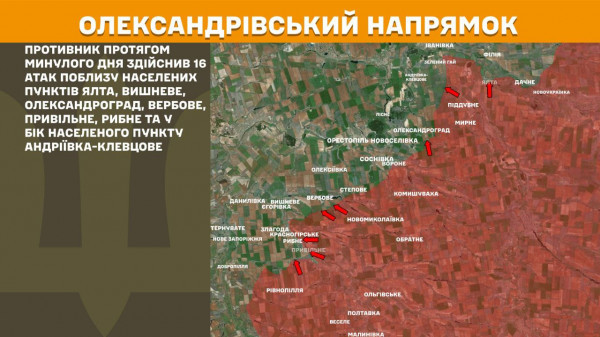 На Олександрівському напрямку противник протягом минулого дня здійснив 16 атак поблизу населених пунктів Ялта, Вишневе, Олександроград, Вербове, Привільне, Рибне та у бік населеного пункту Андріївка-Клевцове.