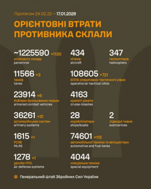 Загальні бойові втрати противника з 24.02.22 по 17.01.26 орієнтовно склали: