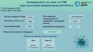 У період з 19 по 25 січня за медичною допомогою звернулися 10 144 мешканці області. Хоча рівень захворюваності все ще на 42,6% нижчий за епідемічний поріг, темпи поширення інфекції зросли — приріст за тиждень склав 21,8%.