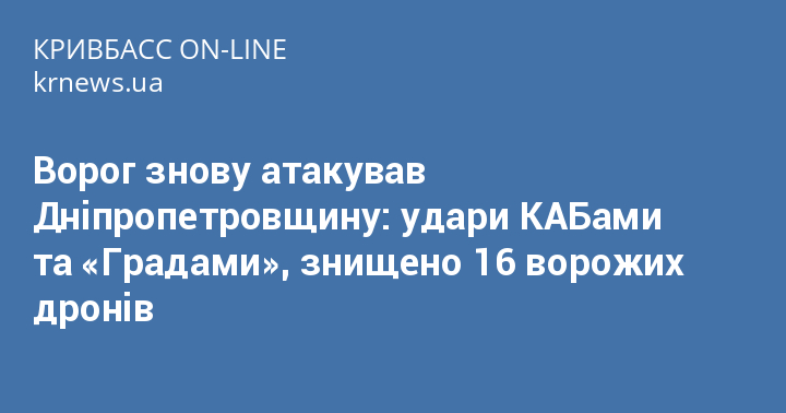 Ворог знову атакував Дніпропетровщину: удари КАБами та «Градами», знищено 16 ворожих дронів