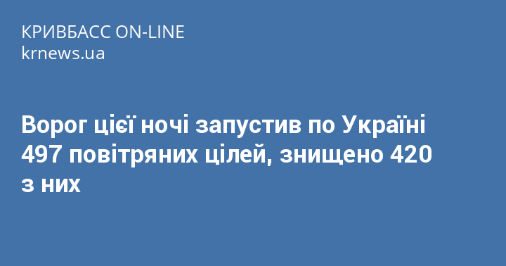 Ворог цієї ночі запустив по Україні 497 повітряних цілей, знищено 420 з них