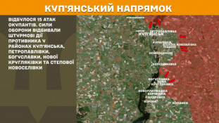 На Куп’янському напрямку минулої доби відбулося 15 атак окупантів. Сили оборони відбивали штурмові дії противника у районах Куп’янська, Петропавлівки, Богуславки, Нової Кругляківки та Степової Новоселівки.