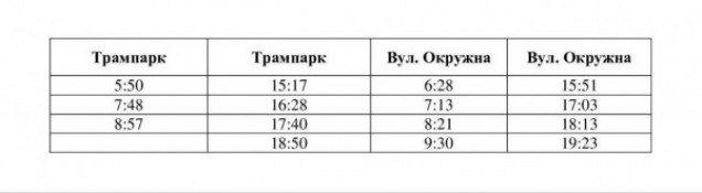 Трамвайний маршрут № 1 курсуватиме від зупинки «Трампарк» до зупинки «Вул. Окружна» (розклад руху додається).