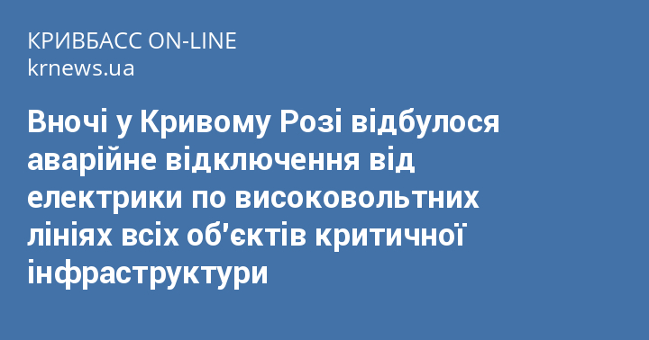 Вночі у Кривому Розі відбулося аварійне відключення від електрики по високовольтних лініях всіх об'єктів критичної інфраструктури