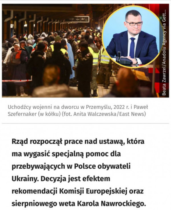 Глава кабінету президента Польщі Шефернакер повідомив, що уряд країни підготував законопроект, який скасує особливий статус українських біженців після 4 березня 2026 року.