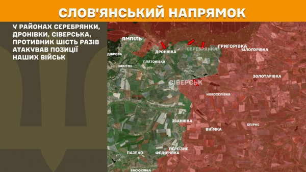 На Слов’янському напрямку, у районах Серебрянки, Дронівки, Сіверська, противник шість разів атакував позиції наших військ.