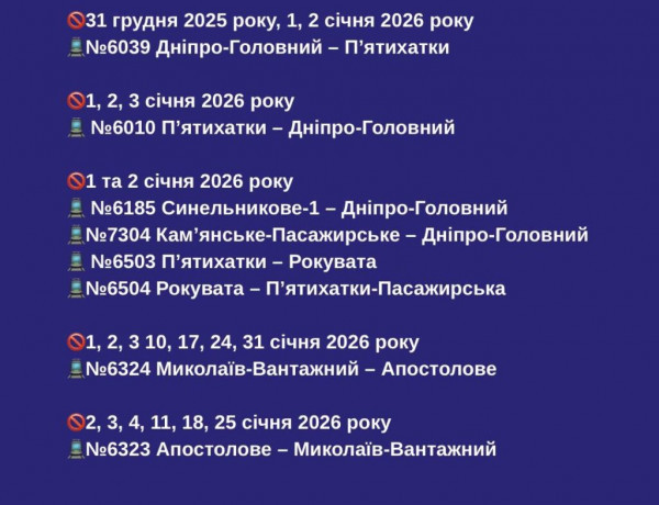 Детальний перелік скасованих рейсів та змін у русі оприлюднено на інформаційних матеріалах для пасажирів. Мандрівників закликають враховувати ці корективи під час планування поїздок.